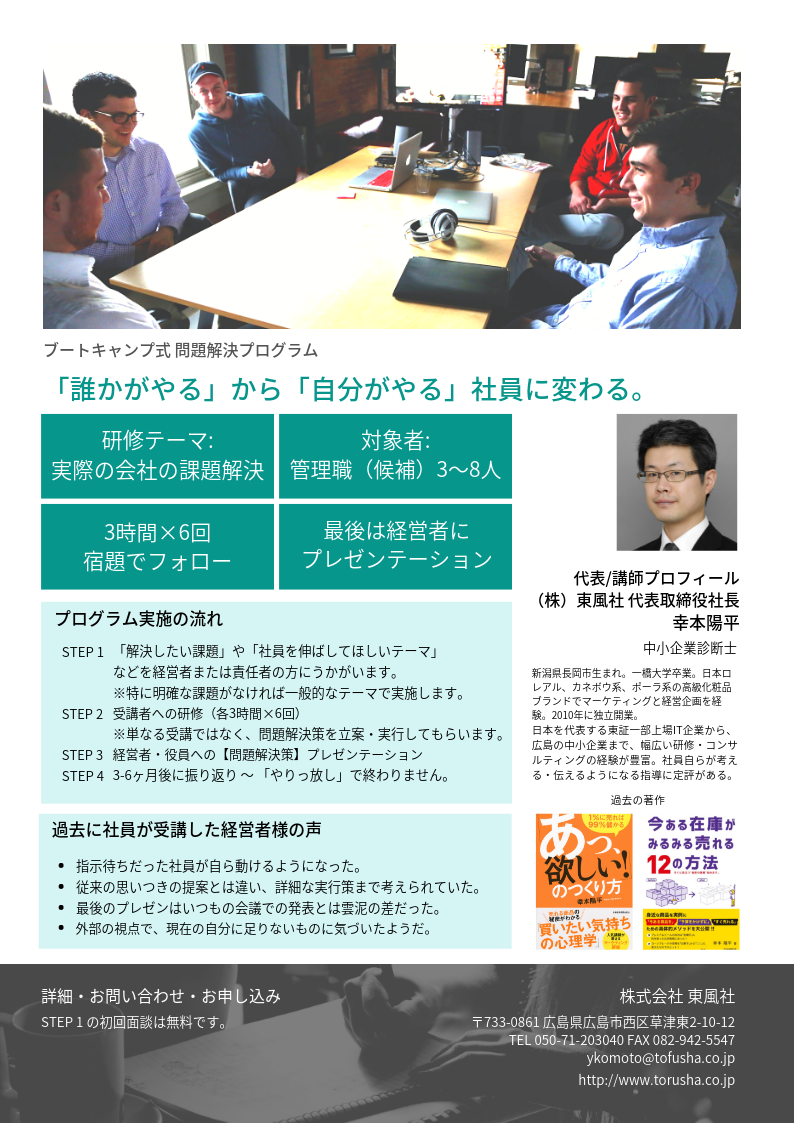【管理職】右腕を育てる 2018.11.012020.06.09社長の「右腕」を育てる、全6回+3回のプログラムです。総費用90万円 (+ 税、交通費・宿泊費など実費)※以下のすべてを含みます。初回お打ち合わせ全6回の研修および宿題などのフォロープレゼンテーション同席、進行3-6ヶ月後の振り返り