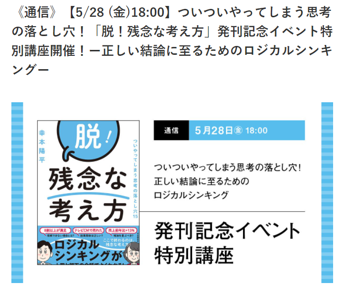 《通信》【5/28 (金)18:00】ついついやってしまう思考の落とし穴!「脱!残念な考え方」発刊記念イベント特別講座開催!ー正しい結論に至るためのロジカルシンキングー