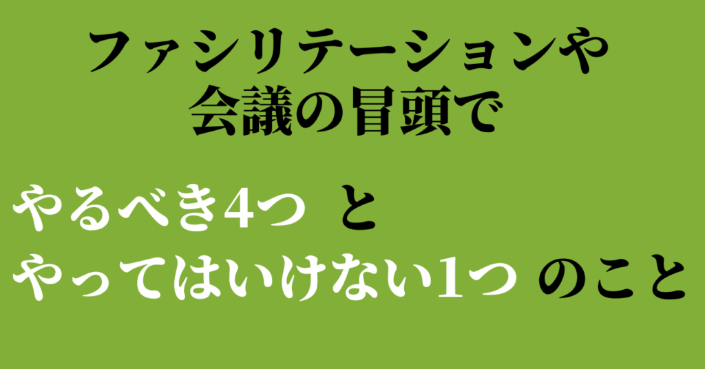 そこで、本格的なファシリテーションを学んだり挑戦したりする前に、ファシリテーションの場面の冒頭、開始時に「やるべき4つのこと」と「やってはいけない1つのこと」をご紹介します。