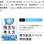 2021年6月30日 / 最終更新日時 : 2021年6月30日 幸本 陽平 終了ご報告 天狼院書店様にて「脱!残念な考え方」発刊記念イベント特別講座を行いました 2021年5月28日、オンラインにて下記講座を開催しました。 http://tenro-in.com/kaisaiyotei/179927 《通信》【5/28 (金)18:00】ついついやってしまう思考の落とし穴!「脱! […]